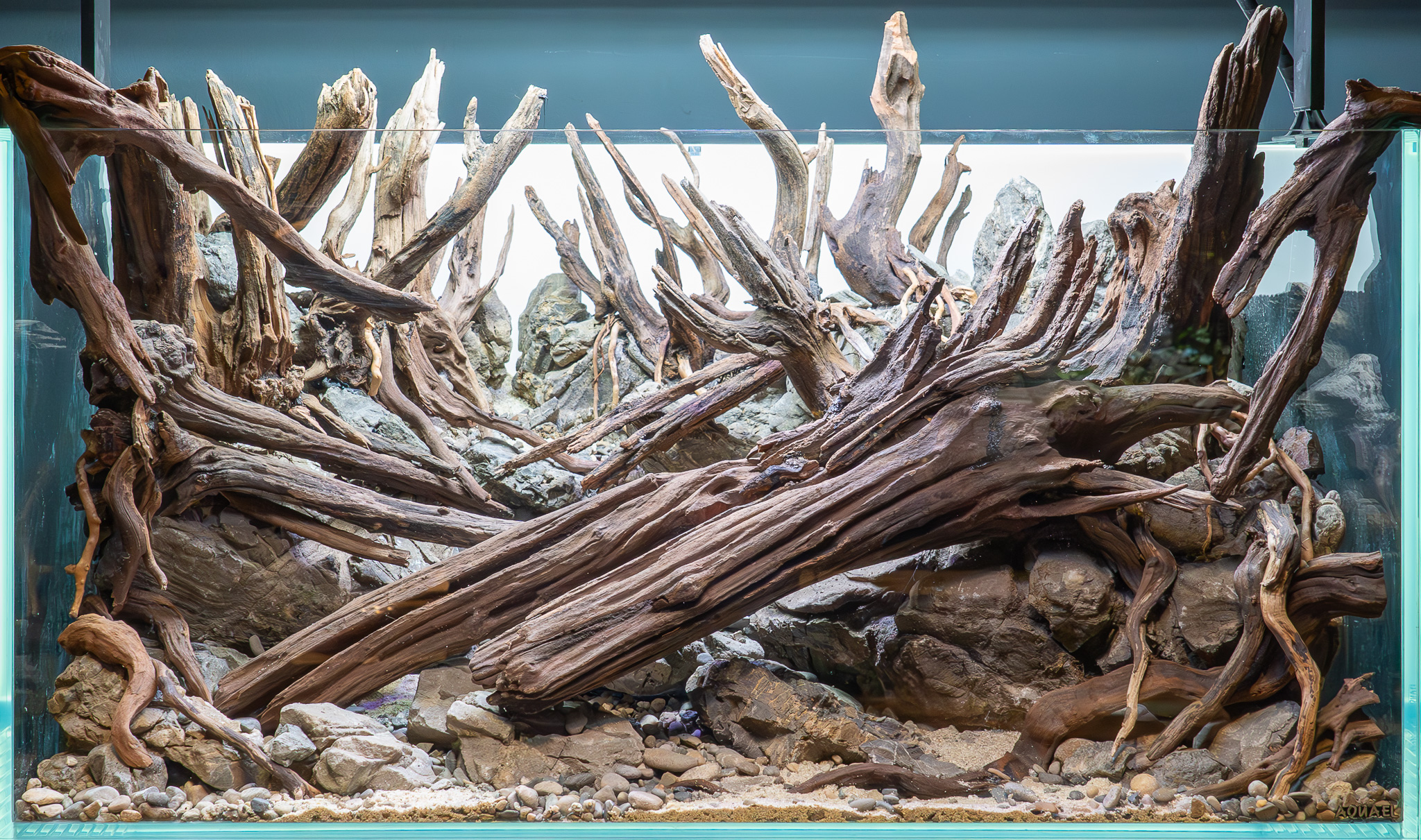 Dieses Layout ist das Ergebnis dieser sehr unterschiedlichen Eindrücke, vereint in einem Aquarium: Totholz und ein Spiel aus kantigen Felsen und runden Kieselsteinen, üppige Pflanzen und gesunde Fische.