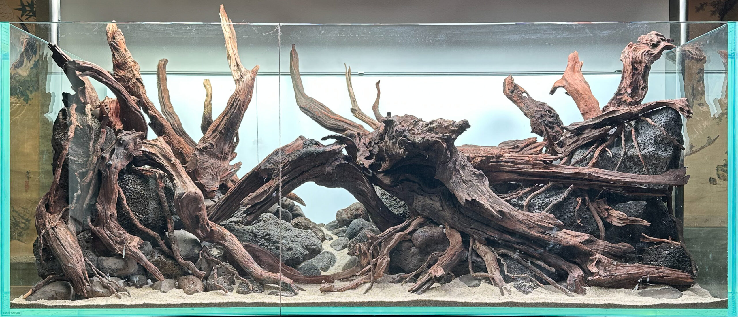 Auch dieses wuchtige Layout steht in einem Wiener Privathaushalt, in dem Fall bei unserem langjährigen Freund und immernoch dem Laden nahestehenden Alexander Hecht. Dieser Beitrag, für den IAPLC 2025 erstellt, mit seinen hohen Hardscape-Aufbauten und der unglaublichen Artenvielfalt, wirkt dennoch nicht schwer, sondern glänzt mit seinem Mix aus Grüntönen, ergänzt durch die einzelnen roten Highlights der Lotusblätter.