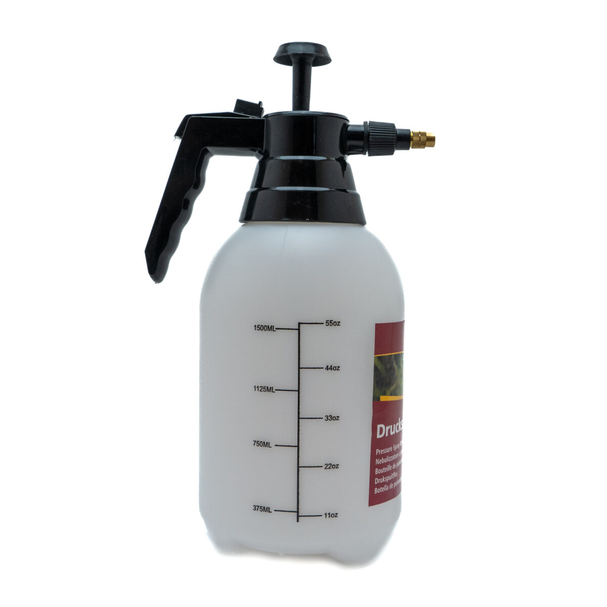 Drucksprühflasche mit Messingdüse und Überdruckventil.