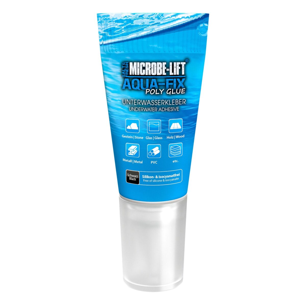 Aqua-Fix Poly Glue eignet sich optimal als Unterwasserkleber zur dauerhaften Fixierung von Gestein, Glas, Holz, Kunststoff, PVC, Metallen u.v.m. Er härtet auch unter Wasser schnell aus und ist sicher in jedem Meerwasser- und Süßwasseraquarium verwendbar.